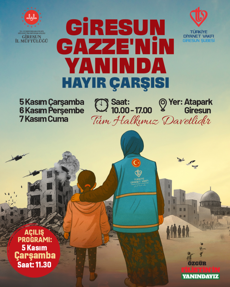 Giresun İl Müftülüğü ve TDV Giresun Şubesi, Filistin'e destek vermek için "Giresun Gazze'ye Destek Veriyor" teması altında "Yardım Çarşısı" adlı etkinlik organize ediyor.