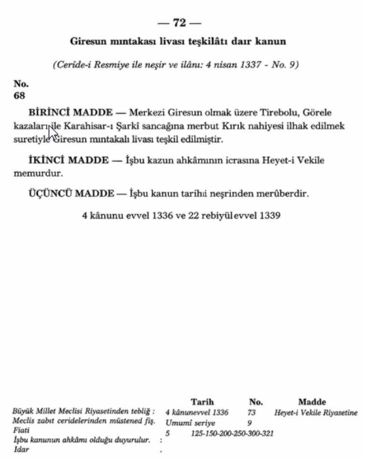 Kanun metni, merkezi Giresun olmak üzere Tirebolu ve Görele kazalarıyla Karahisar-ı Şarki sancağına bağlı Kırık nahiyesinin birleştirilmesiyle Giresun müstakil livasının kurulduğunu yazdı. Kanun 4 Nisan 1921 tarihli Resmî Ceride’de yayımlandı ve yürürlüğe girdi. 1924 Anayasası’nın 89. maddesiyle liva adı vilayete dönüştü; böylece Giresun’un bugünkü il statüsü anayasal adını da kazanmış oldu.
