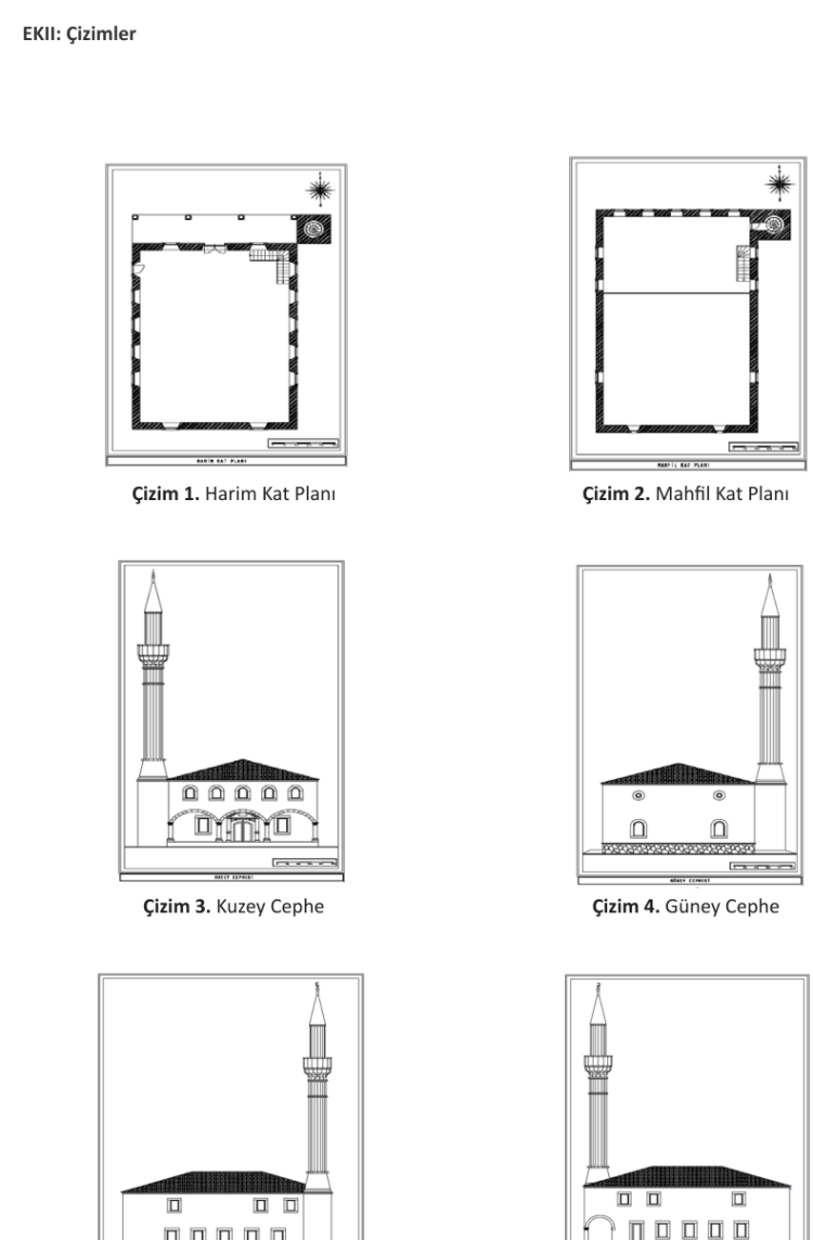 Aynı akademik çalışma, bu görsel veriden hareketle restitüsyon paftaları üretiyor: harim kat planı, mahfil kat planı ve cephe çizimleri.