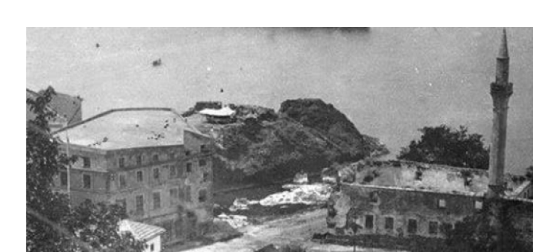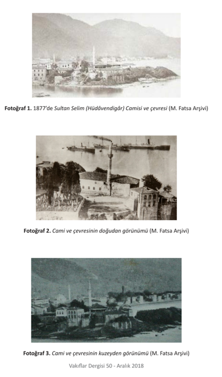 Sultan Selim Camii ve çevresi, 1877. Fotoğraf, yapının liman sahası bitişiğindeki doğal burun üzerinde yer aldığını ve tarihî varlığını doğrudan gösteriyor. Kaynak: Gazanfer İltar – Mehmet Fatsa, Vakıflar Dergisi, 2018.