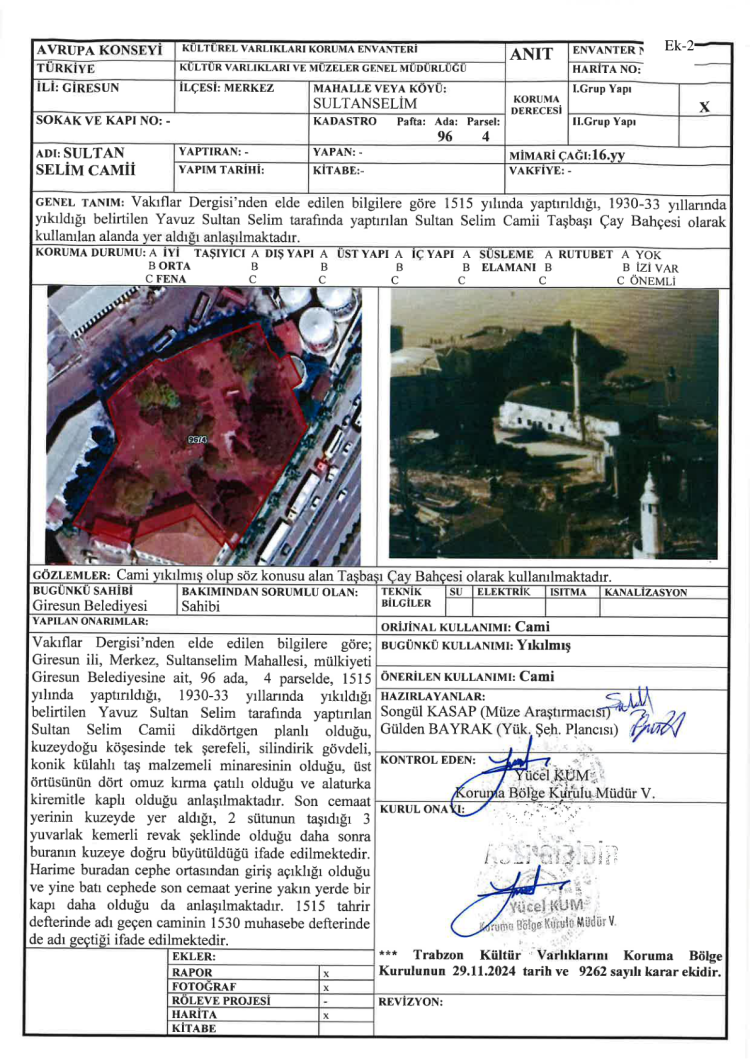 Trabzon Kültür Varlıklarını Koruma Bölge Kurulu, 23 Eylül 2024 tarihli başvuru, kurum görüşleri ve uzman raporu sonrasında 29 Kasım 2024’te Giresun Merkez Sultanselim Mahallesi 96 ada 4 parselde tanımlanan Sultan Selim Camii’ni tescil etti.