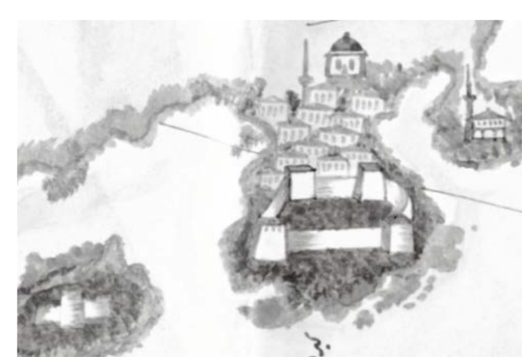 1852 tarihli şehir çiziminde Sultan Selim Camii. Çizim, yapının doğal burun üzerindeki genel konumunu ve kıyı-topografya ilişkisini gösteriyor. Kaynak: İltar – Fatsa, 2018.