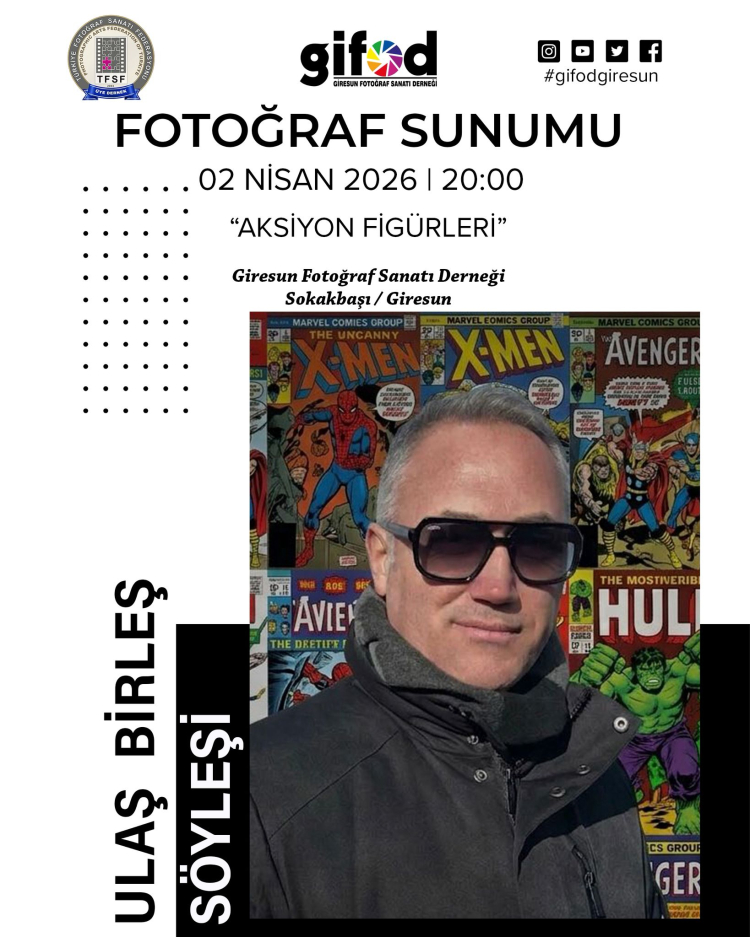 Giresun'da 2 Nisan Perşembe 20.00'de GİFOD'da Ulaş Birleş'in aksiyon figürleriyle oluşturduğu fotoğraf sunumu ve söyleşisi düzenlenecek. Etkinlik, Fevzipaşa Caddesi No:60'daki GİFOD Kültür ve Sanat Merkezi'nde.