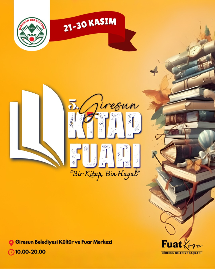 Belediye Kültür ve Fuar Merkezi'nde, 21–30 Kasım 2025 tarihlerinde yapılacak 5. Giresun Kitap Fuarı; yazar buluşmaları, imza etkinlikleri ve çocuklara yönelik aktivitelerle dolu dolu geçecek. Fuara, 10.00–20.00 saatleri arasında ziyaret edilebilecek.