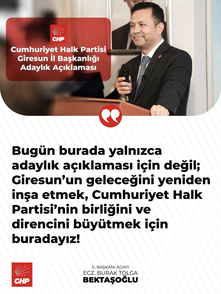 CHP Giresun İl Başkanlığı seçimleri öncesinde Burak Bektaşoğlu resmen adaylığını duyurdu. CHP Lideri Özgür Özel ve Ekrem İmamoğlu'na selam gönderip birlik mesajı ileten Bektaşoğlu, Giresun’da sosyal demokrasi değerlerini yaymayı amaçladığını belirtti. Seçim tarihi 19 Ekim'de.