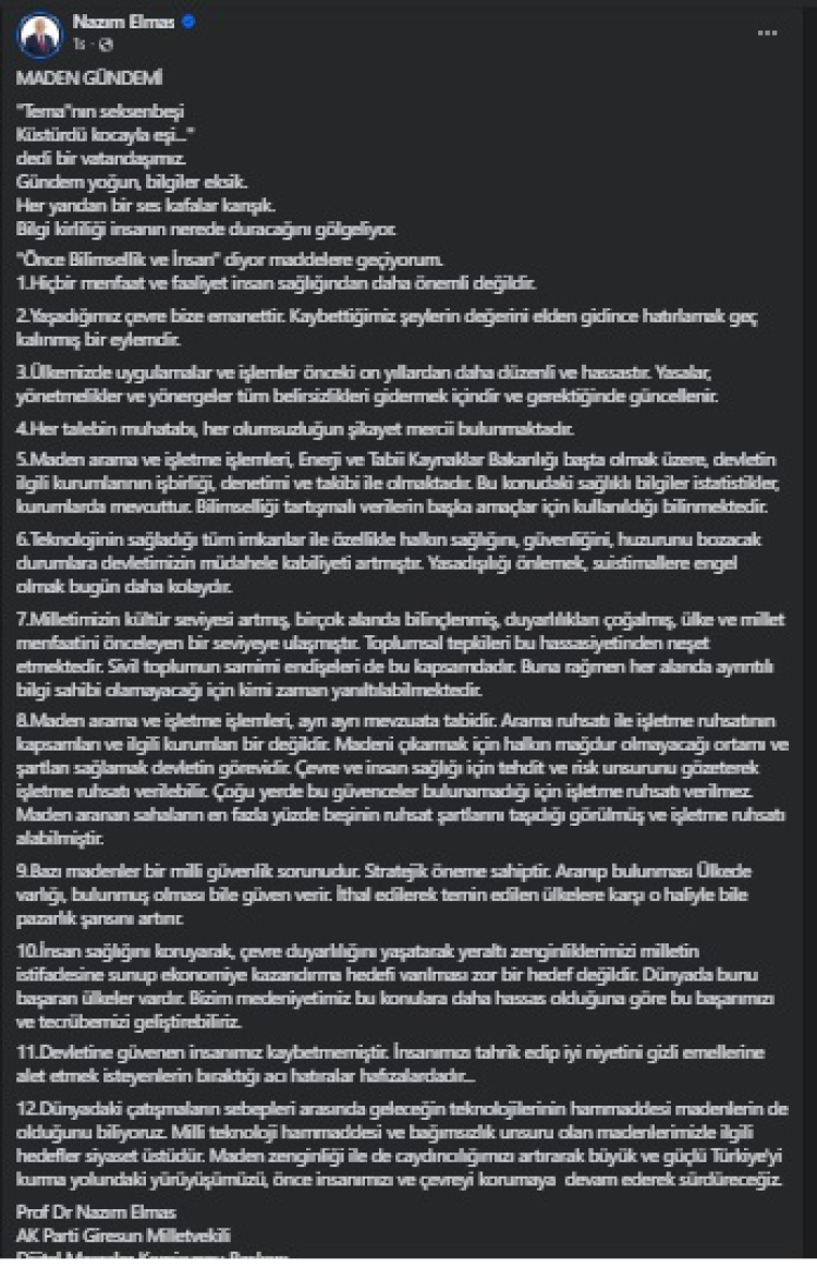 AK Parti Giresun Milletvekili ve Dijital Mecralar Komisyonu Başkanı Prof. Dr. Nazım Elmas, maden tartışmaları üzerine 12 maddelik bir değerlendirme yayımladı. Elmas, insan sağlığı, çevre güvenliği, devlet denetimi ve stratejik maden politikası başlıklarında kapsamlı mesaj verdi.