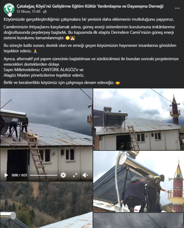 Çatalağaç Köyü Derneği, Derindere Camii'ne güneş enerjisi sistemi kurulması ve yol çalışmaları için Cantürk Alagöz ile Alagöz Maden'e teşekkür etti. Paylaşım, Giresun'da maden karşıtı eylemlerin arttığı bir dönemde yerel destek mesajı olarak yorumlandı.