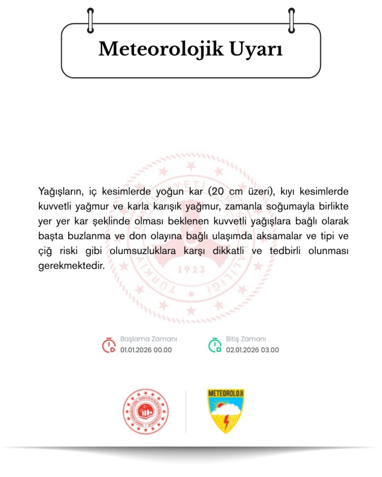Yetkililer; buzlanma, don, tipi, görüş mesafesinde azalma, ulaşımda aksamalar ve yüksek kesimlerde çığ riski gibi olumsuzluklara karşı vatandaşların dikkatli ve tedbirli olmalarını istedi. Uyarının 2 Ocak 2026 saat 03.00’e kadar geçerli olduğu duyuruldu.