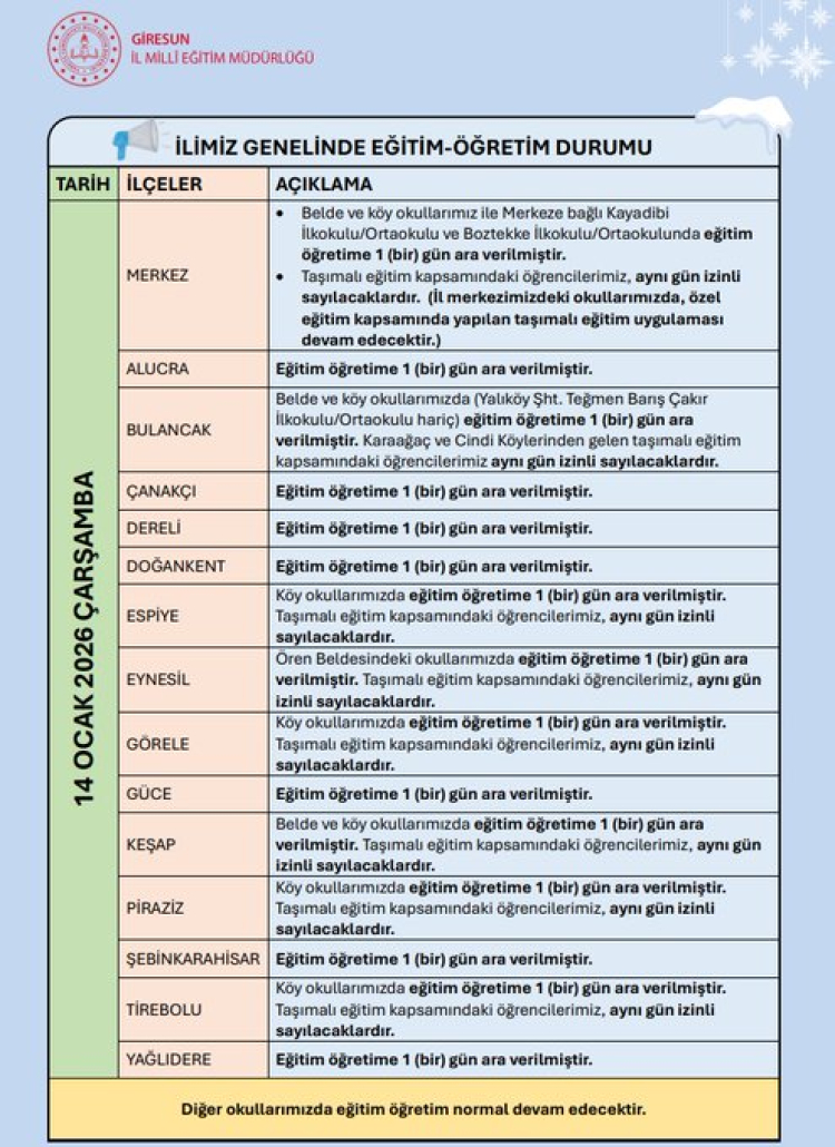 Giresun genelinde etkisini sürdüren olumsuz hava koşulları nedeniyle 14 Ocak 2026 Çarşamba günü eğitim-öğretime ilişkin yeni tedbirler alındı. T.C. Giresun Valiliği tarafından yapılan açıklamada, tatil kararının ilçe ve eğitim türüne göre farklılık gösterdiği bildirildi.
