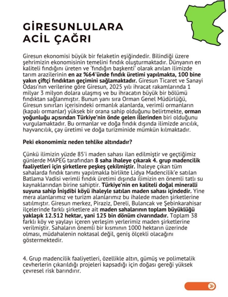 Dernek, asıl tehlikenin madencilik ihaleleriyle büyüdüğünü savundu. Paylaşılan metinde, Giresun’un yüzde 85’inin maden sahası ilan edildiği, MAPEG tarafından 8 sahanın 4. grup madencilik faaliyetleri için ihaleye çıkarıldığı, bu alanların bir bölümünün fındık üretim sahaları, su kaynakları, mera alanları ve turizm bölgelerini kapsadığı ileri sürüldü.