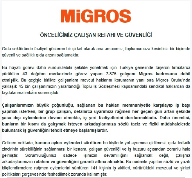 Migros, açıklamasında çalışma arkadaşlarının güvenliği ve iş huzurunu korumanın öncelikli görevleri olduğunu vurgulayarak, sözlü ve yazılı bilgilendirmelere rağmen eylemlerini sürdüren 141 kişinin iş akdinin feshedildiğini duyurdu. Söz konusu kararın hem gıda tedarik zincirinin sürekliliğini sağlamak hem de çalışanların refah ve güvenliğini garanti altına almak amacıyla yapıldığı bildirildi.